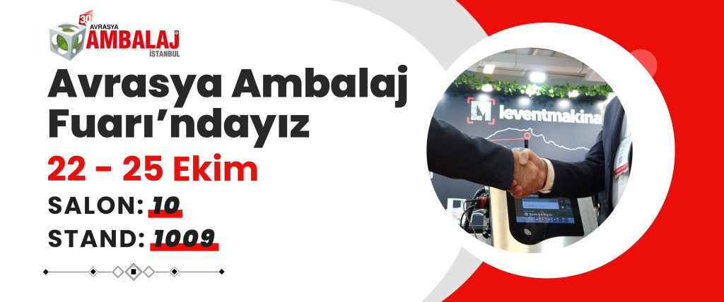 Levent Makina olarak, sektördeki en yeni teknolojileri ve çözümlerimizi paylaşmak üzere 22 – 25 Ekim 2025 tarihleri arasında düzenlenecek Avrasya Ambalaj Fuarı’na katılıyoruz. Ambalaj sektörünün en önemli buluşma noktalarından biri olan bu fuarda, bizleri Salon 10, Stand 1009’da ziyaret edebilirsiniz.